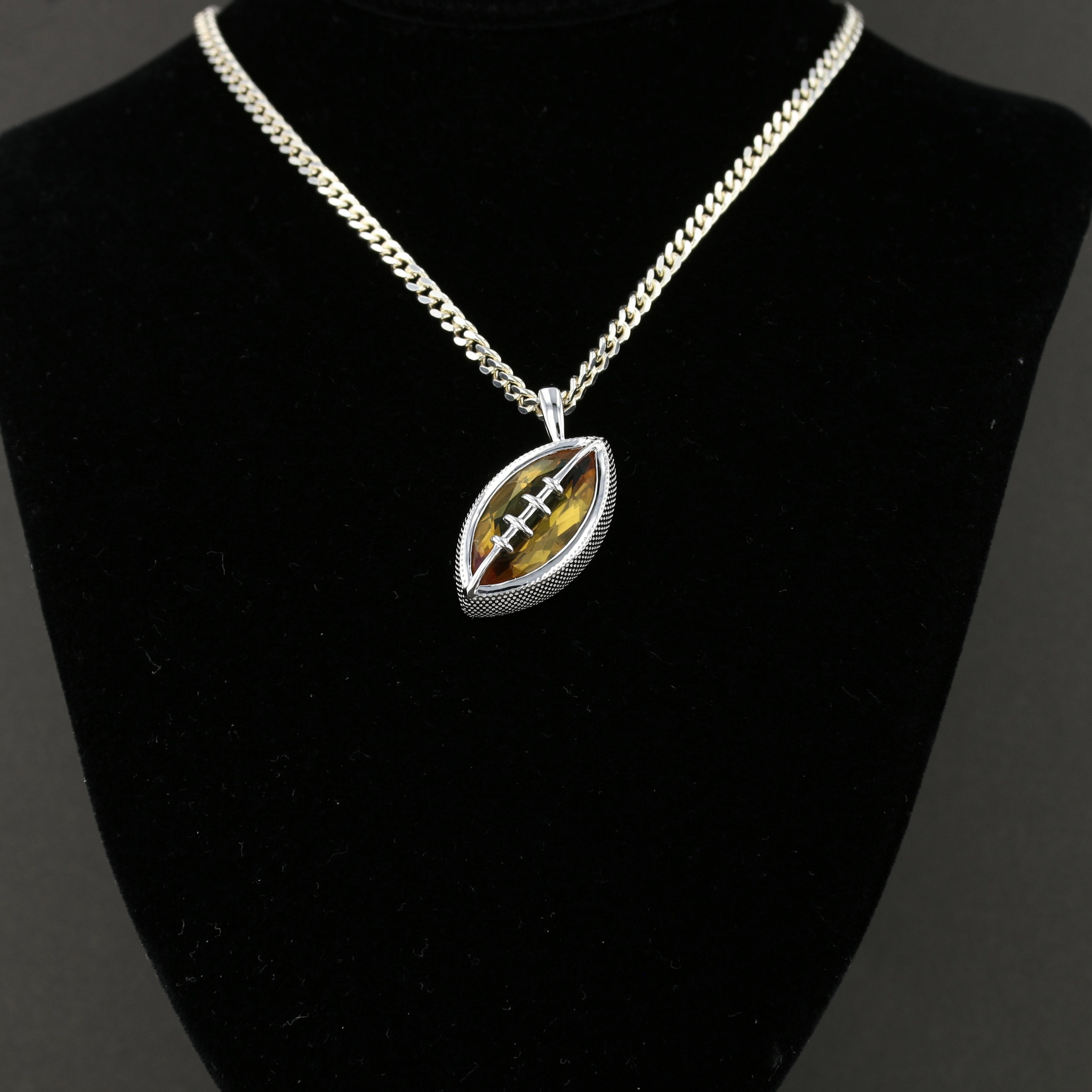 Show your team spirit with the unique VooDooStone Football Pendant, crafted in solid sterling silver. This eye-catching piece is perfect for football lovers and fans looking to add a bold, sporty touch to their collection. With its striking design and high-quality silver craftsmanship, this pendant is both durable and stylish, making it the ultimate accessory for game day or any occasion.