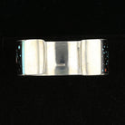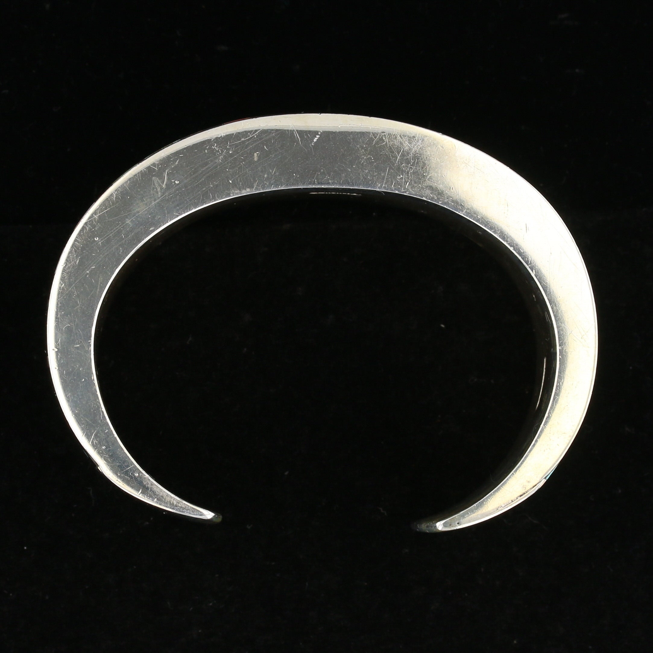 Rare vintage Native American micro inlay cuff in sterling silver (80.4g). Handcrafted with turquoise, coral & jet, featuring a cosmic-inspired design
