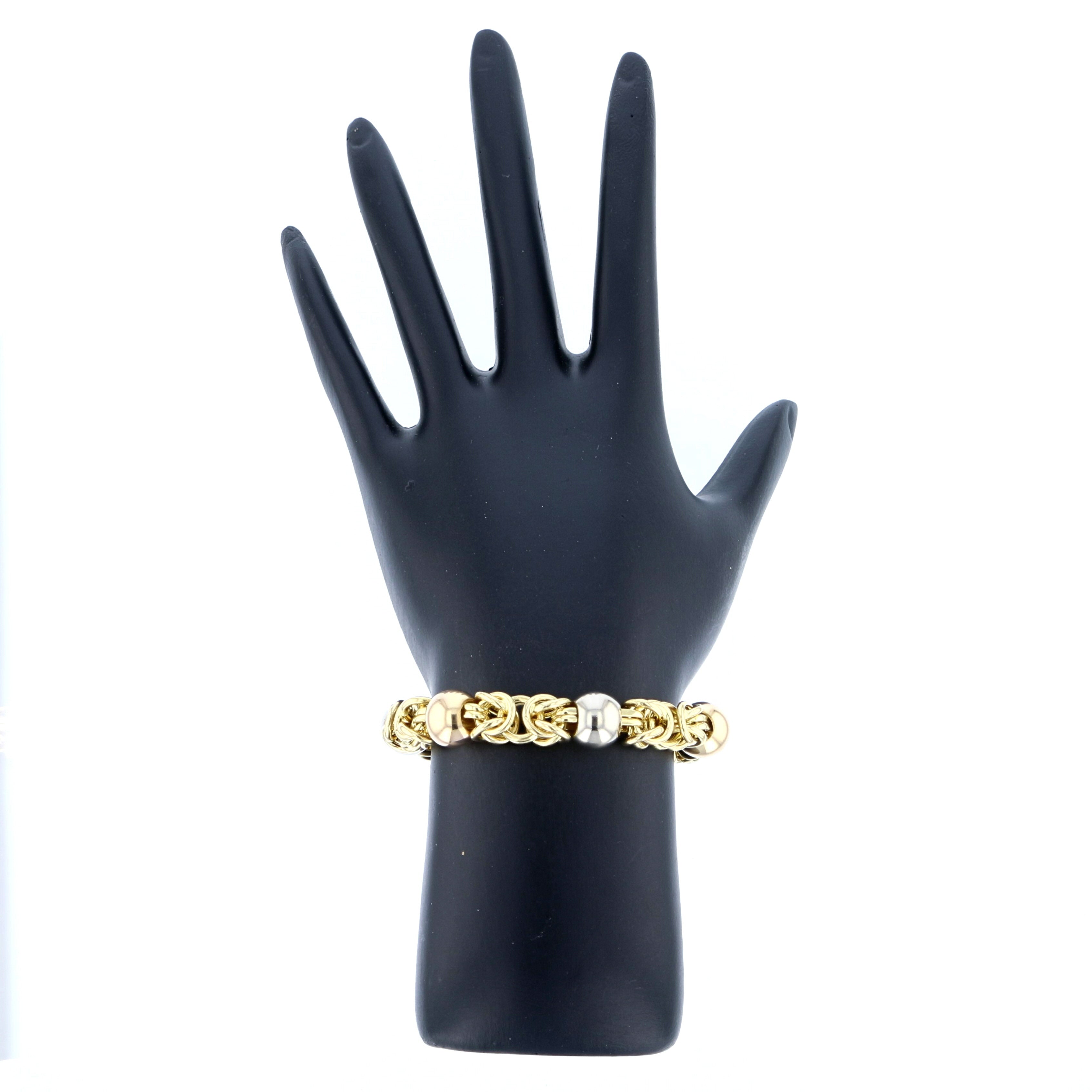 Vintage 18K yellow gold Byzantine link bracelet with tri-color gold beads, measuring 8 inches long and weighing 23.4 grams. This elegant bracelet features intricate Byzantine-style woven links in polished 18K yellow gold, accented with contrasting white and rose gold beads for a sophisticated tri-color look. The substantial 23.4-gram weight provides a luxurious feel on the wrist, while the secure oversized spring ring clasp ensures comfortable everyday wear.