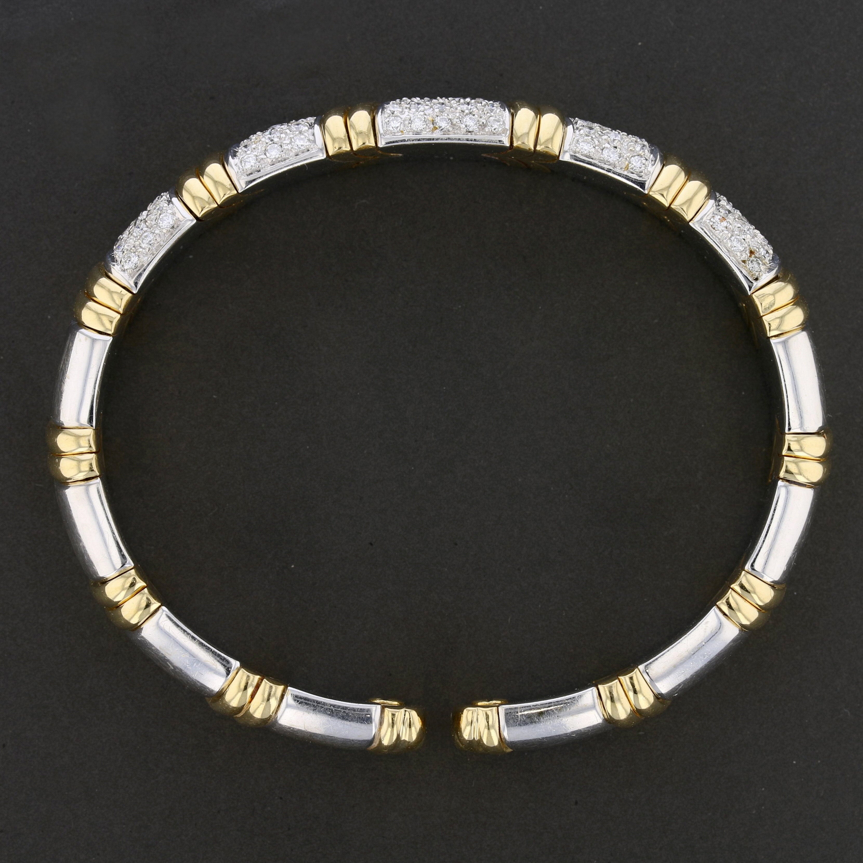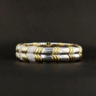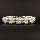 This bold and luxurious vintage bracelet is crafted in rich 18K yellow and white gold, showcasing a striking two-tone segmented design with pavé-set round diamonds. Weighing 53.4 grams, the bracelet features 120 round brilliant cut diamonds totaling approximately 1.2 carats. The diamonds are graded J–K in color and I1 in clarity, offering warm brilliance with vintage character. The geometric styling, paired with screw motif accents and hinged construction, gives this piece a distinctive high-end designer aesthetic. It’s a standout bracelet built for collectors and statement jewelry lovers alike.