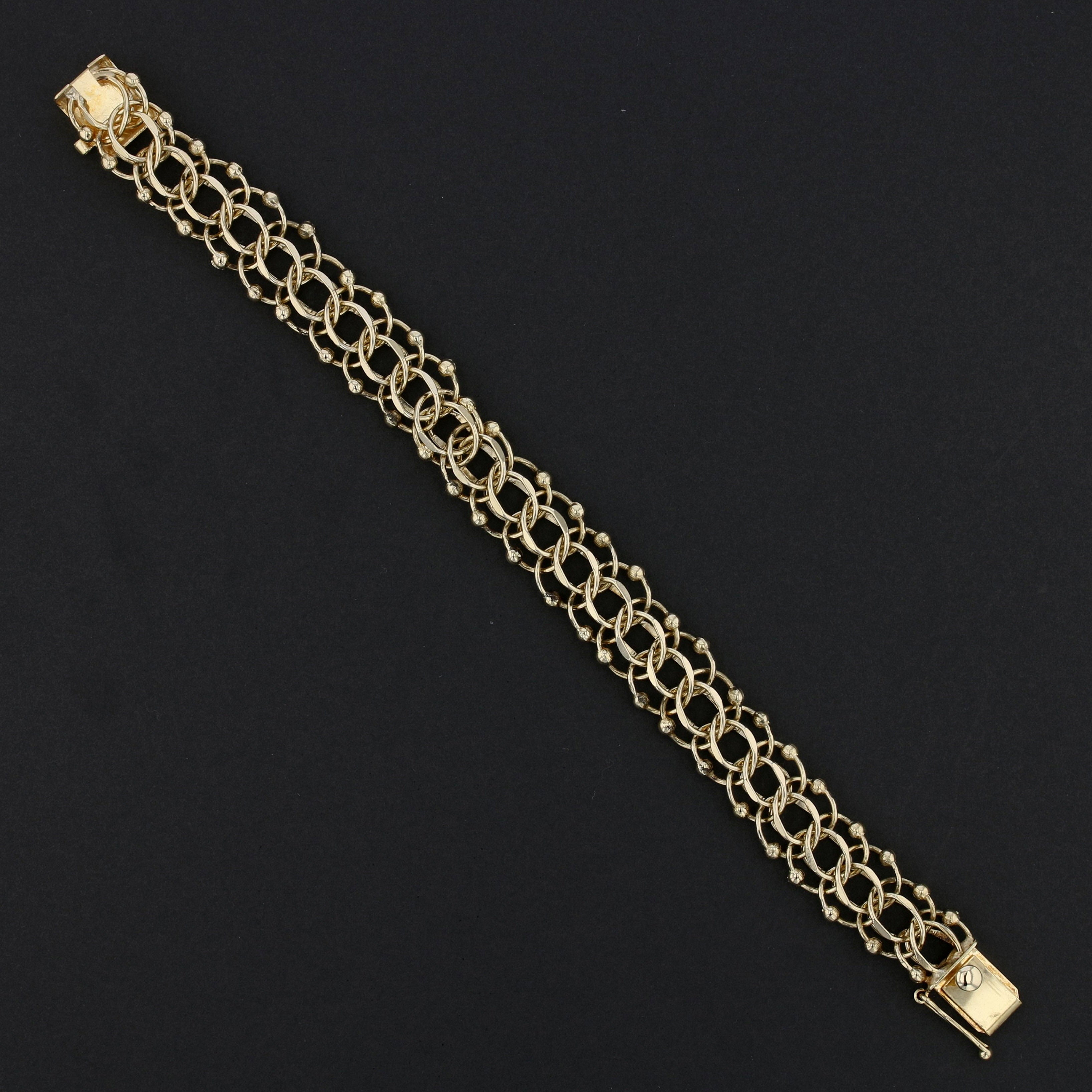 Made of genuine 14 karat yellow gold, this vintage bracelet secures with a classic box clasp and safety latch for added peace of mind. Whether you're a collector or simply looking for a distinctive piece of gold jewelry, this bracelet delivers unmatched craftsmanship and lasting value.
