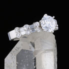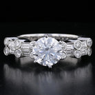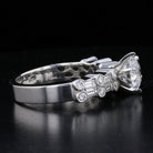 This stunning vintage 18K white gold engagement ring features a dazzling round-cut diamond, graded J in color, that steals the spotlight with its timeless brilliance. The band is adorned with an elegant combination of bezel-set and baguette-cut diamonds, creating a sophisticated and modern look. Weighing 6.86 grams, this vintage ring is a perfect symbol of love and commitment, blending classic beauty with contemporary design.
