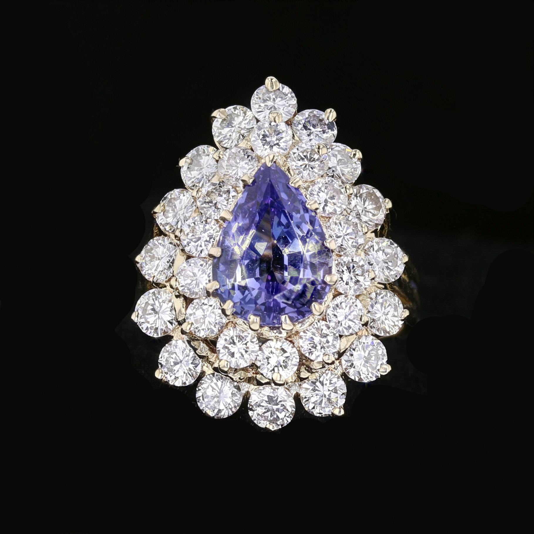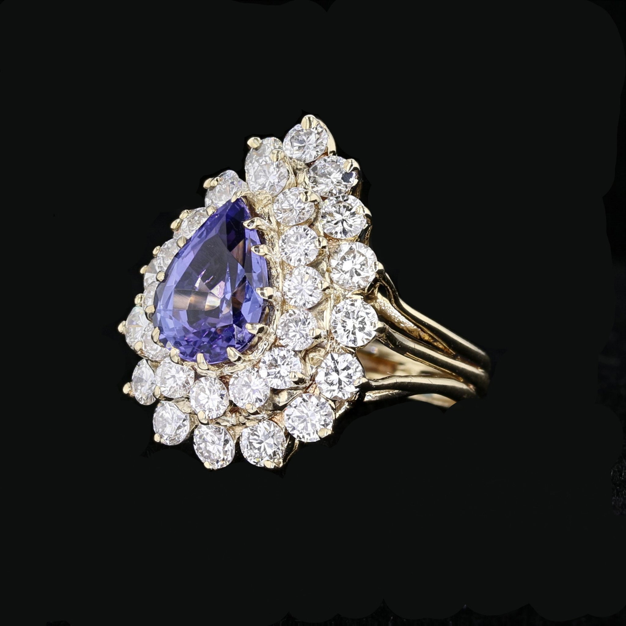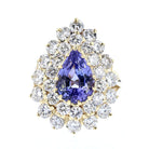 Experience the enchanting beauty of our Vintage Tanzanite Ring. Crafted in 14K yellow gold, this ring showcases a captivating pear-shaped tanzanite in a vibrant purple hue, measuring 10x8mm and weighing 2.48 carats. Its vintage design exudes timeless elegance. The round diamonds, totaling 1.84 carats, with an H color and SI1 clarity, accentuate the tanzanite's allure. With a weight of 6.8 grams, this ring is a stunning and lightweight statement piece that adds a touch of glamour to any occasion.