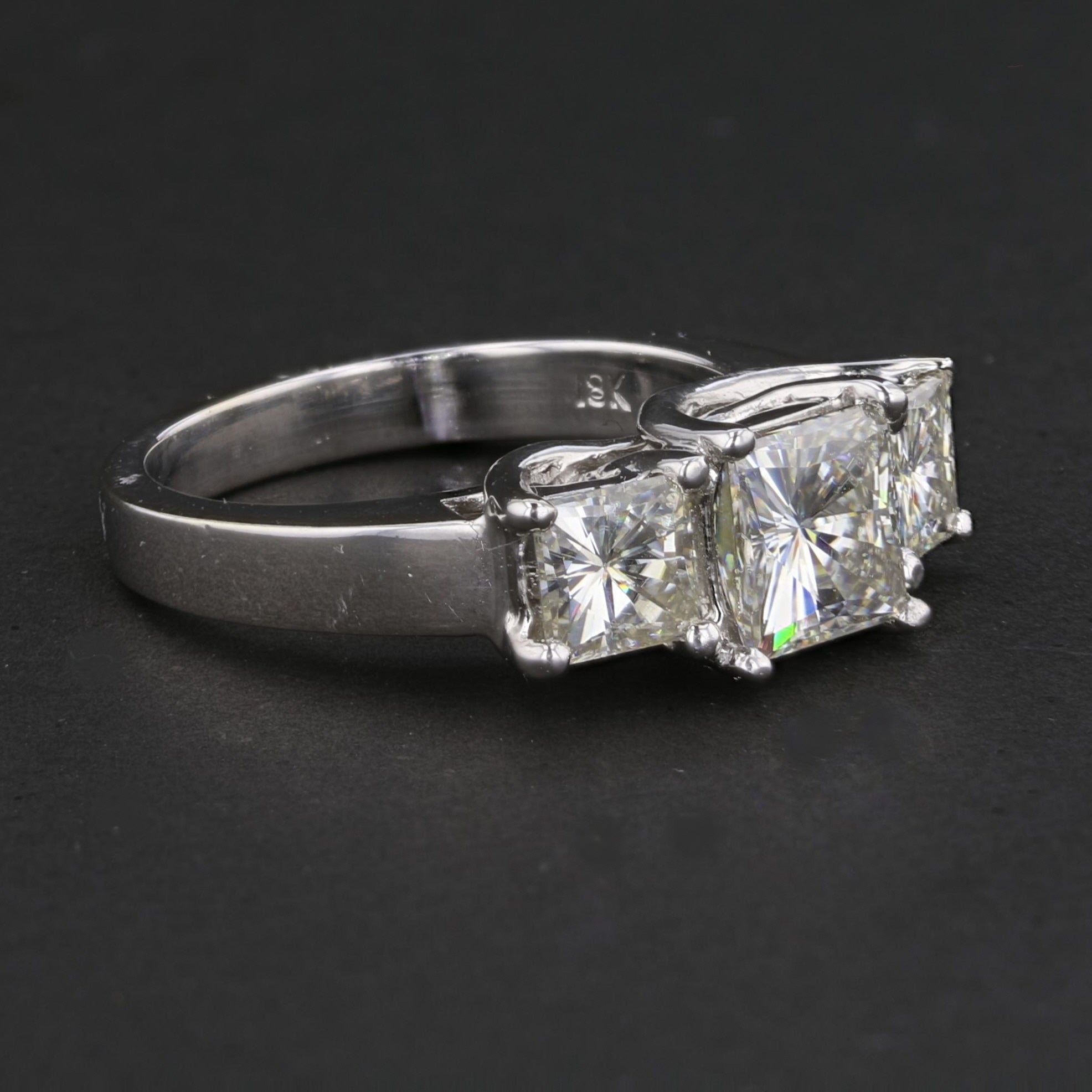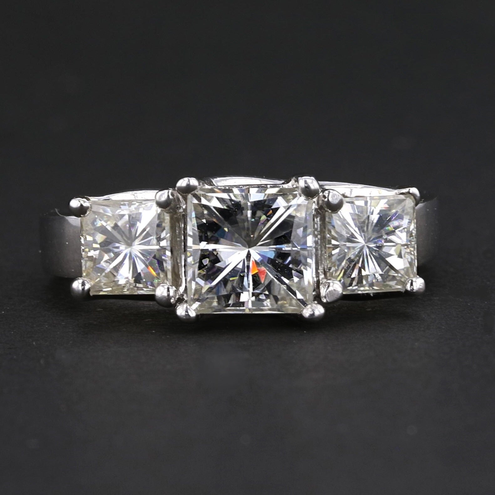 Embrace vintage charm with this stunning Vintage Mossanite Ring. Crafted from 18K white gold and weighing 8 grams, it features a striking arrangement of princess-cut mossanite gemstones with a total weight of 3.15 carats. The brilliant D-E color and VS1 clarity make it a timeless piece of luxury.