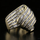 Elevate your style with this exquisite vintage diamond ring featuring a wave-like design encrusted with 149 sparkling baguette-cut diamonds. Crafted from 14K yellow gold and weighing 12.34 grams, this stunning ring is a true statement piece. The 4.5 total carat weight diamonds are graded J-K in color and I2 in clarity, offering brilliance and sophistication in every detail. Perfect for the discerning collector, this ring is a dazzling addition to any jewelry collection.
