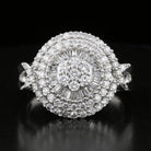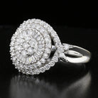 Vintage 14K white gold diamond halo ring featuring 1.62ct round and 1.2ct baguette diamonds in a floral-inspired design. Perfect for size 7.5.