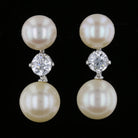 Antique Akoya pearl earrings with 0.66ct round diamonds in 14K white gold. Features 9mm and 7.5mm creamy pearls. Item 893751. Elegant and timeless.