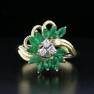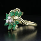 Vintage 14K yellow gold ring featuring 16 marquise emeralds (2.24ct) and 3 round diamonds (0.18ct). Elegant and timeless design. Item code 892703.