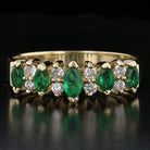 This exquisite vintage emerald and diamond ring is a timeless addition to any jewelry collection. Featuring five beautifully cut marquise emeralds, interspersed with eight sparkling round diamonds, this ring offers a stunning contrast between the lush green of the emeralds and the brilliance of the diamonds. Set in a sleek yellow gold band, it's the perfect choice for adding a touch of vintage elegance to your everyday style or for special occasions.