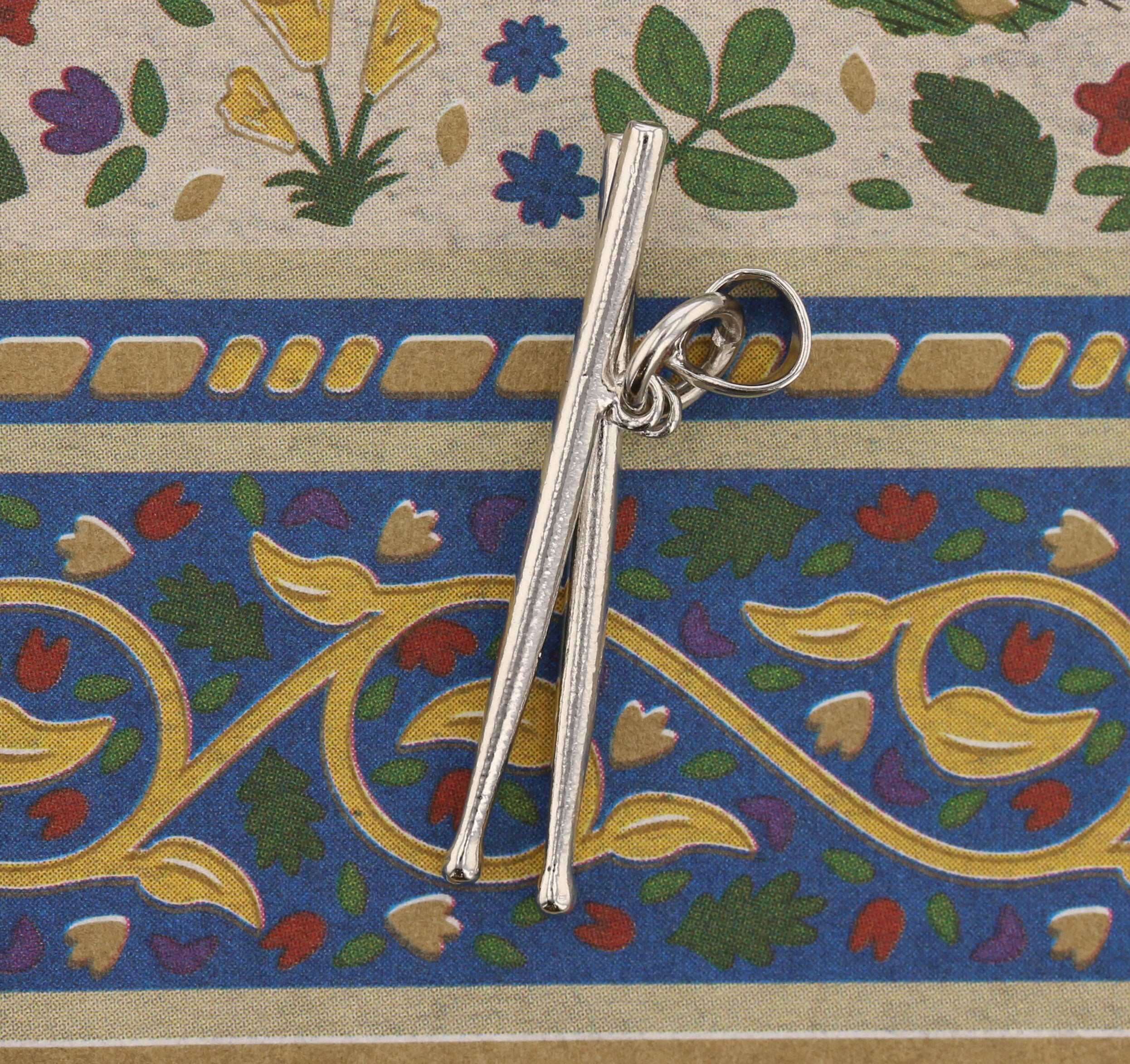 A 2 drum sticks 3D sterling silver charm or pendant would be a unique and eye-catching piece of jewelry for anyone who loves music. The charm would be made of high-quality sterling silver and heavily coated with rhodium for a long-lasting white shine. It would feature a detailed, three-dimensional design of two drumsticks, with the sticks able to move independently of each other. The charm would be small in size, measuring 3.0cm in length (including the bail) and 0.5cm in width, and would be relatively lightweight at 2 grams. The coating of rhodium on the charm would prevent it from tarnishing, so you would not need to polish the charm for years to come.