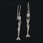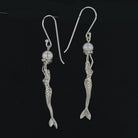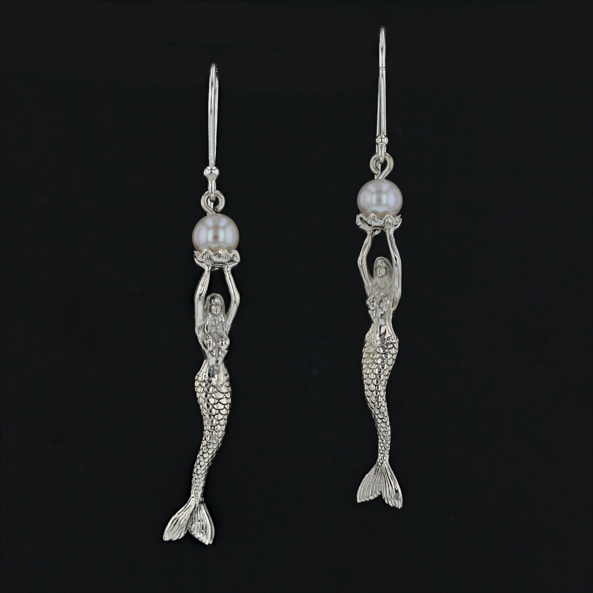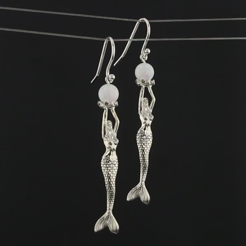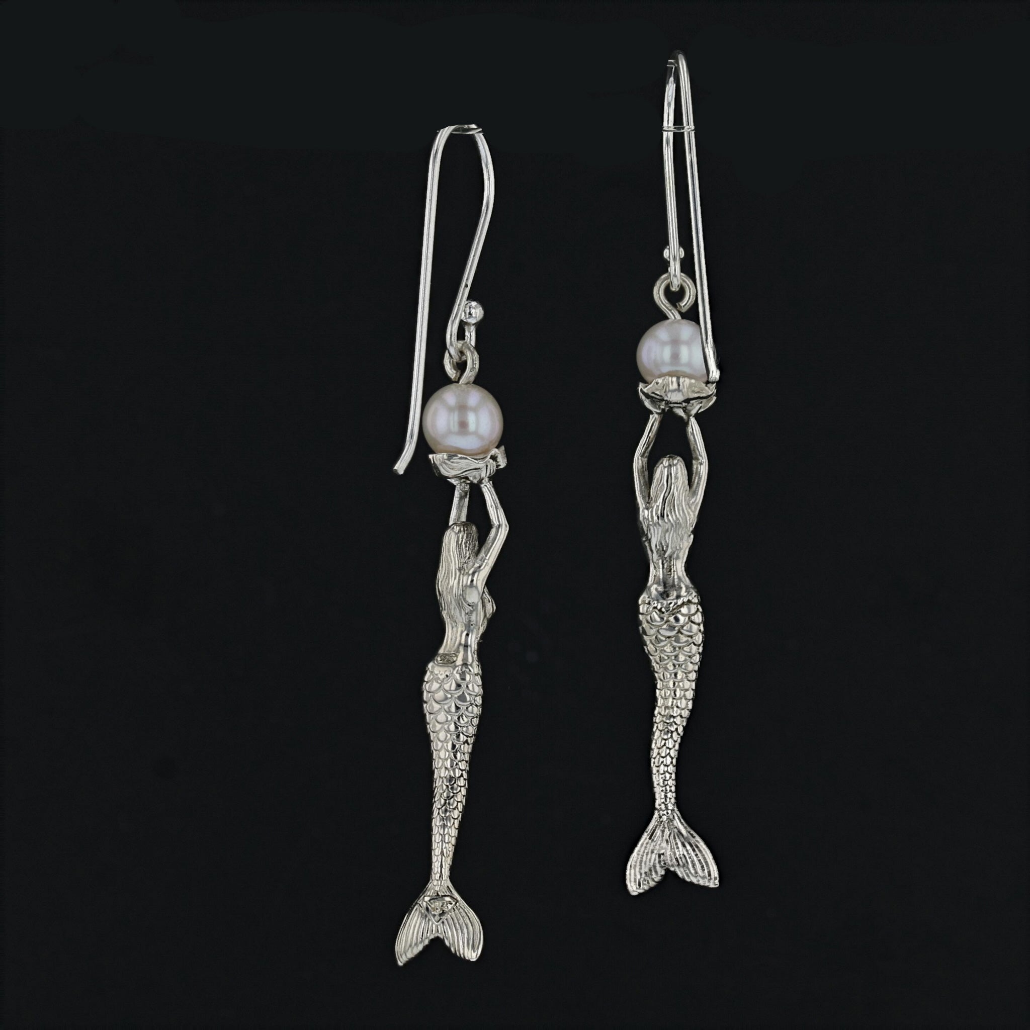 Indulge in the enchanting beauty of these Mermaid Stretching Up High Earrings adorned with a captivating lustrous round fresh water pearl. The mermaid gracefully extends her arms in an offering, holding the opal pearl delicately on an open clam platform. The meticulously detailed face and scales of the mermaid enhance the overall allure of these earrings. Crafted with sterling silver (.925), these earrings are a thoughtful and finished piece of jewelry.