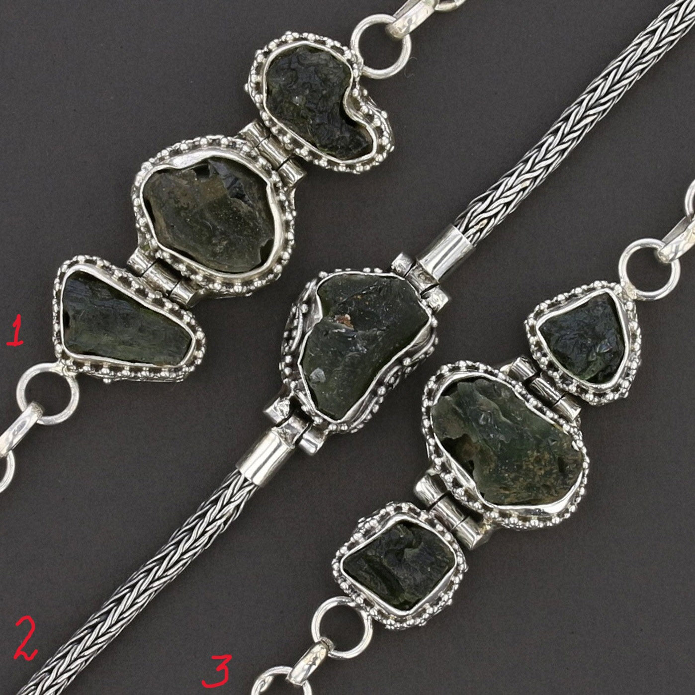Each bracelet is crafted from pure sterling silver (.925 stamped) and features a top-grade natural Moldavite stone – raw, vibrant, and full of cosmic power.