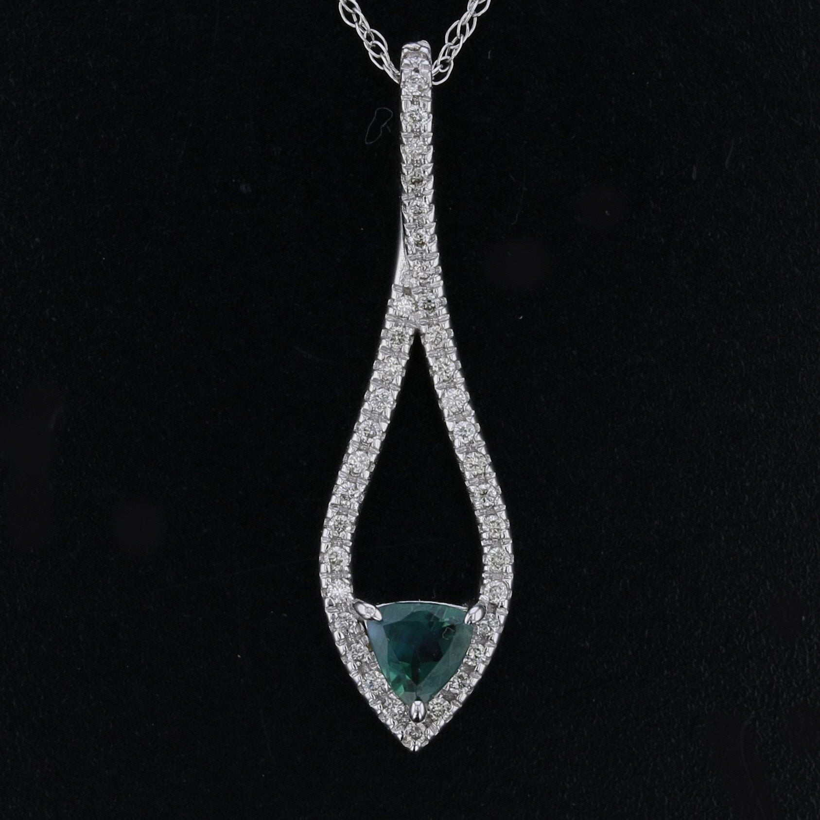 Elegant 14K white gold necklace with 0.25 ct triangle-cut Alexandrite and 30 round diamonds (0.15 ct total). Sophisticated and unique. Item Code: 893485.