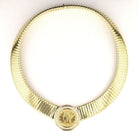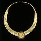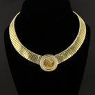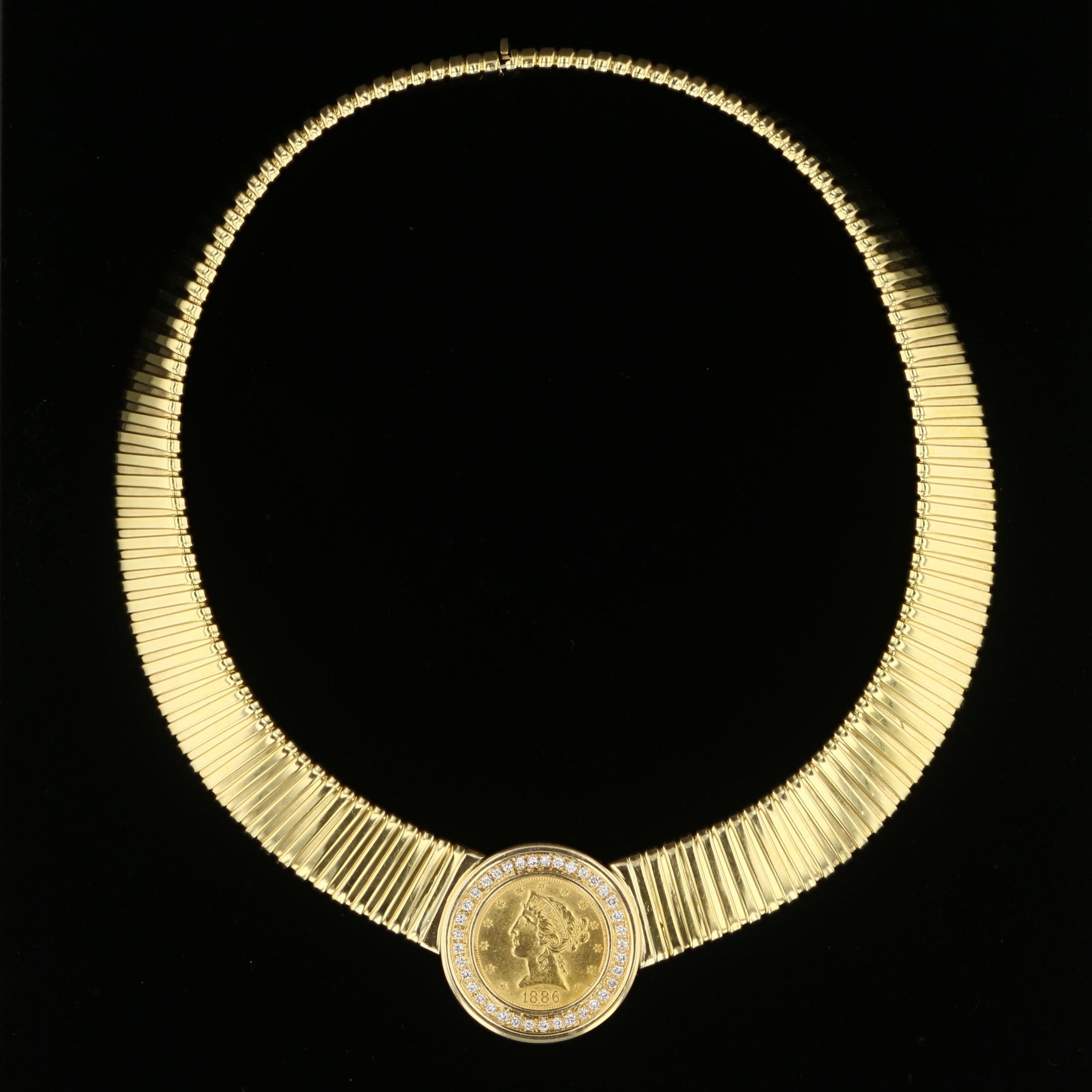 Magnificent vintage 18K yellow gold Cleopatra-style choker necklace featuring an authentic 1880 $5 Liberty gold coin centerpiece surrounded by a sparkling diamond halo. This exceptional piece weighs an impressive 102 grams and showcases museum-quality craftsmanship with its iconic graduated collar design.