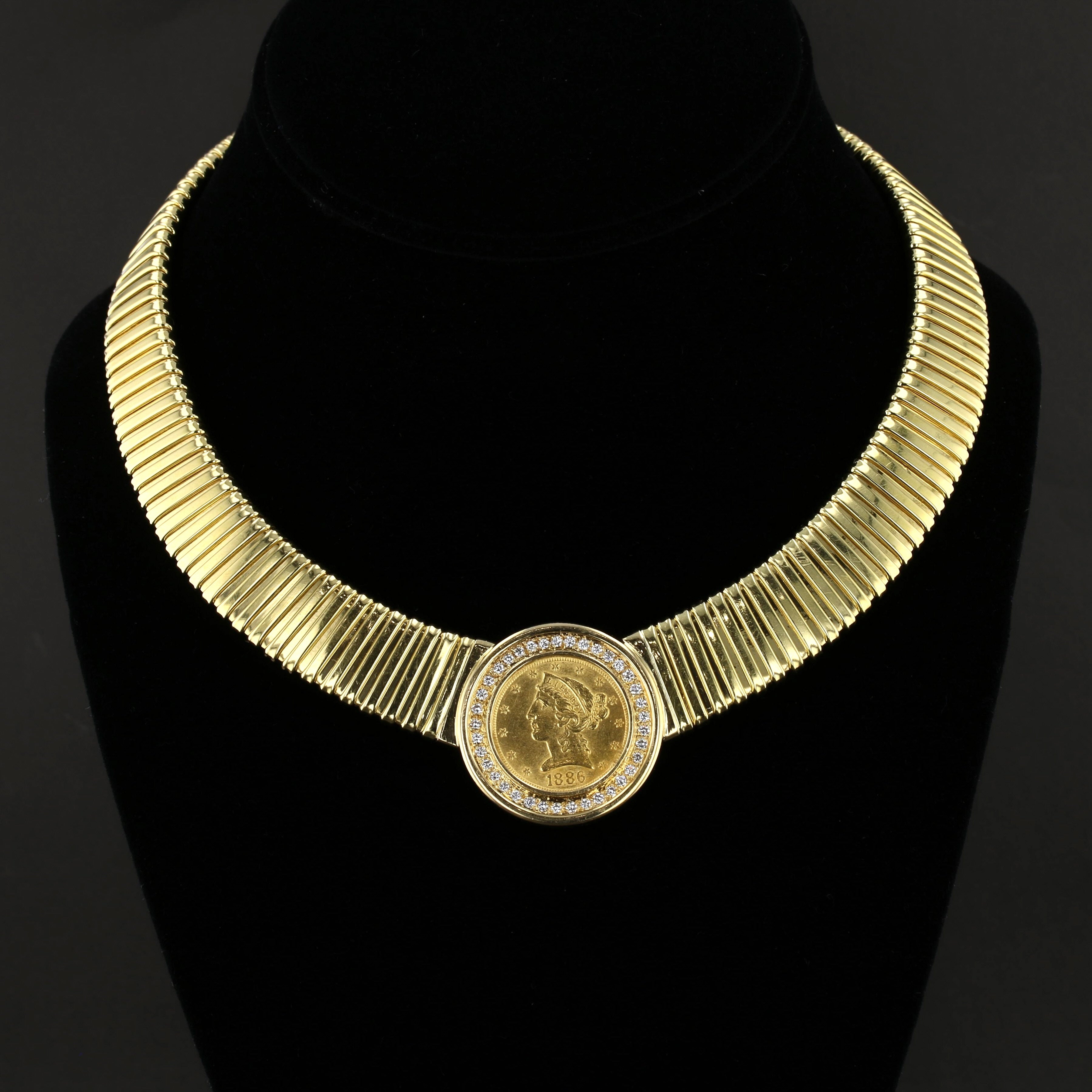Vintage 18K Yellow Gold 1880 $5 Liberty Coin Diamond Choker Necklace