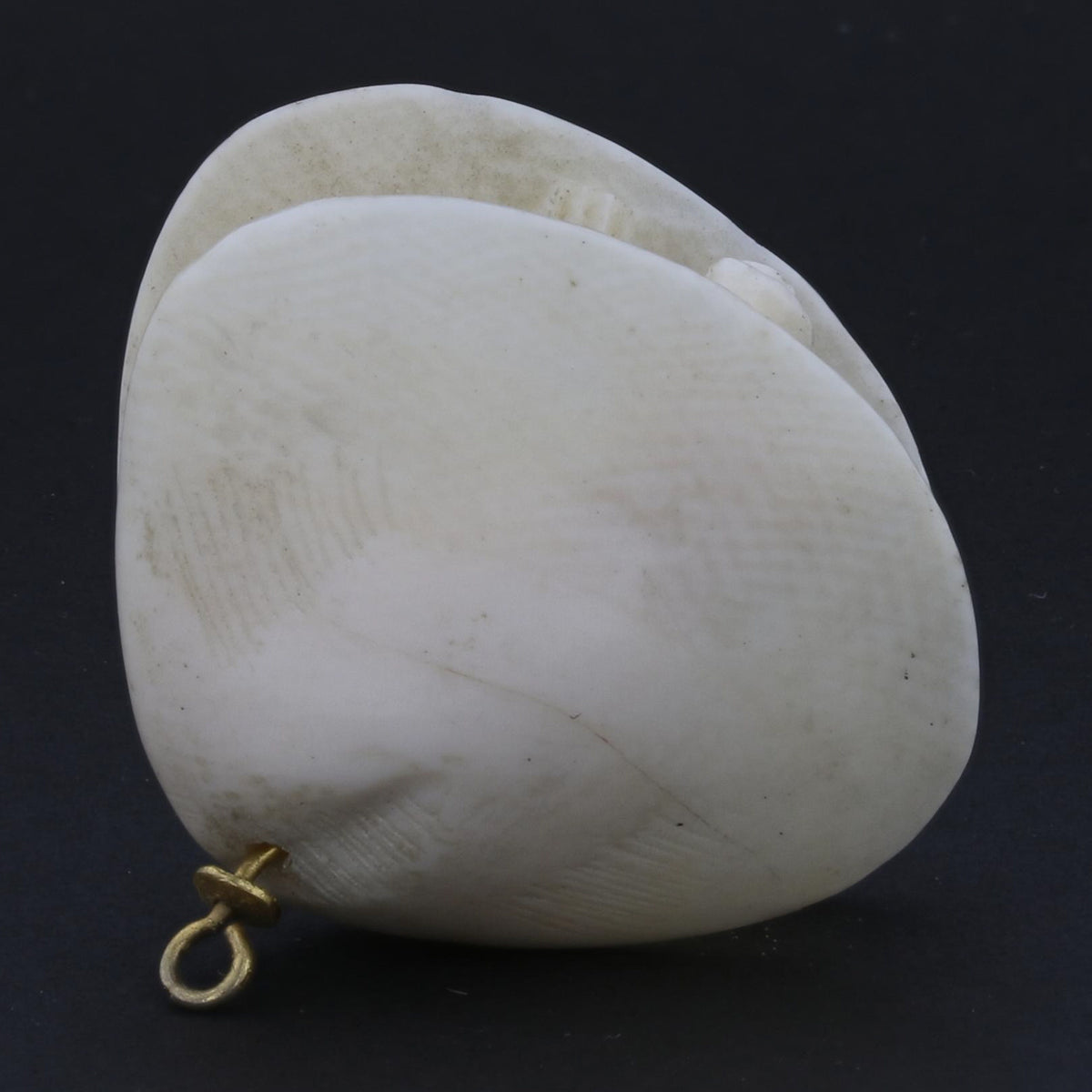 "Antique ivory netsuke pendant with clam and hidden animal carving, 10.2g. Rare collectible and wearable art. Item Code: 882638."