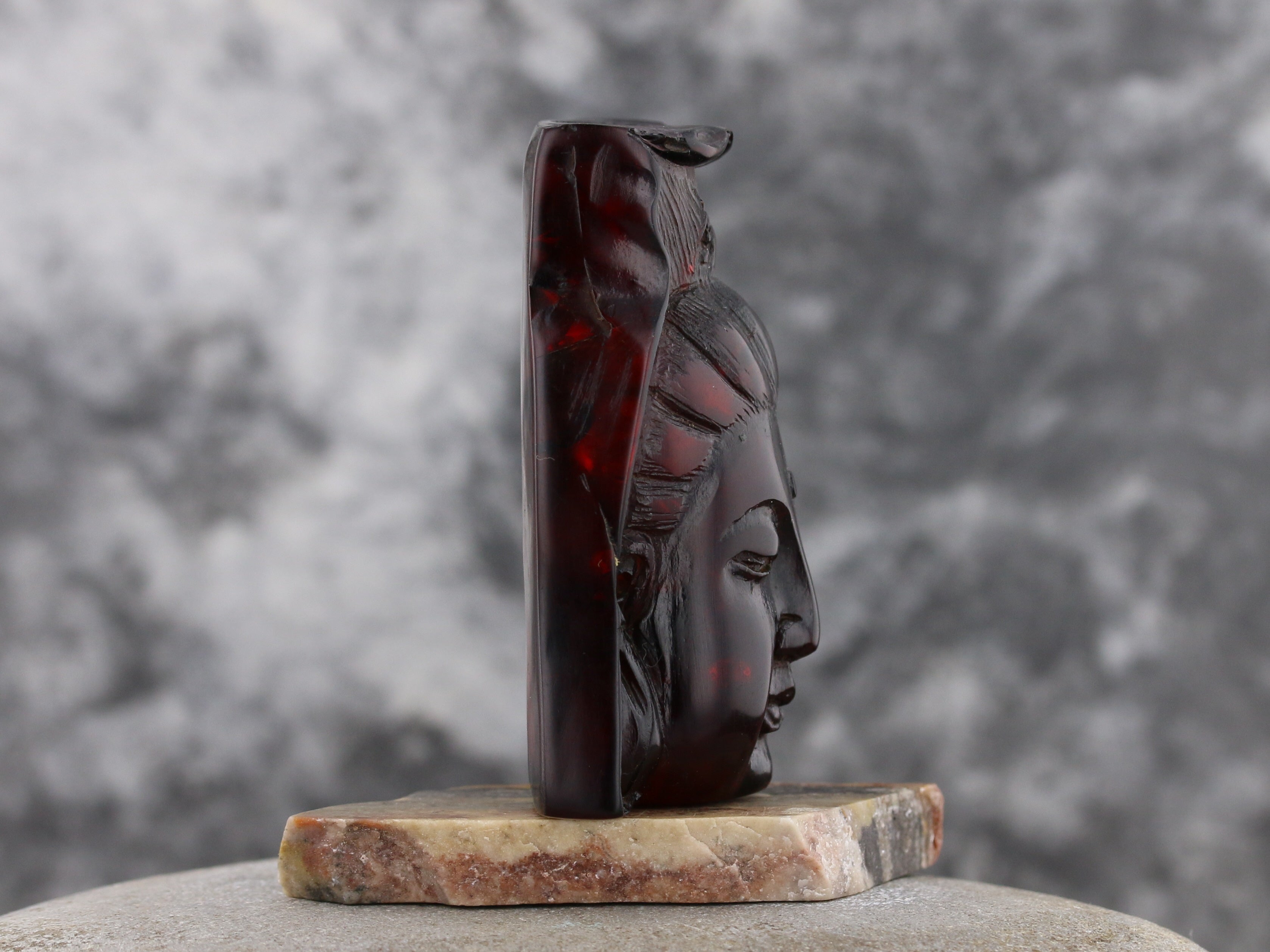 Cherry amber is prized for its rich red hue and natural luster, enhancing the intricacy of the carving.