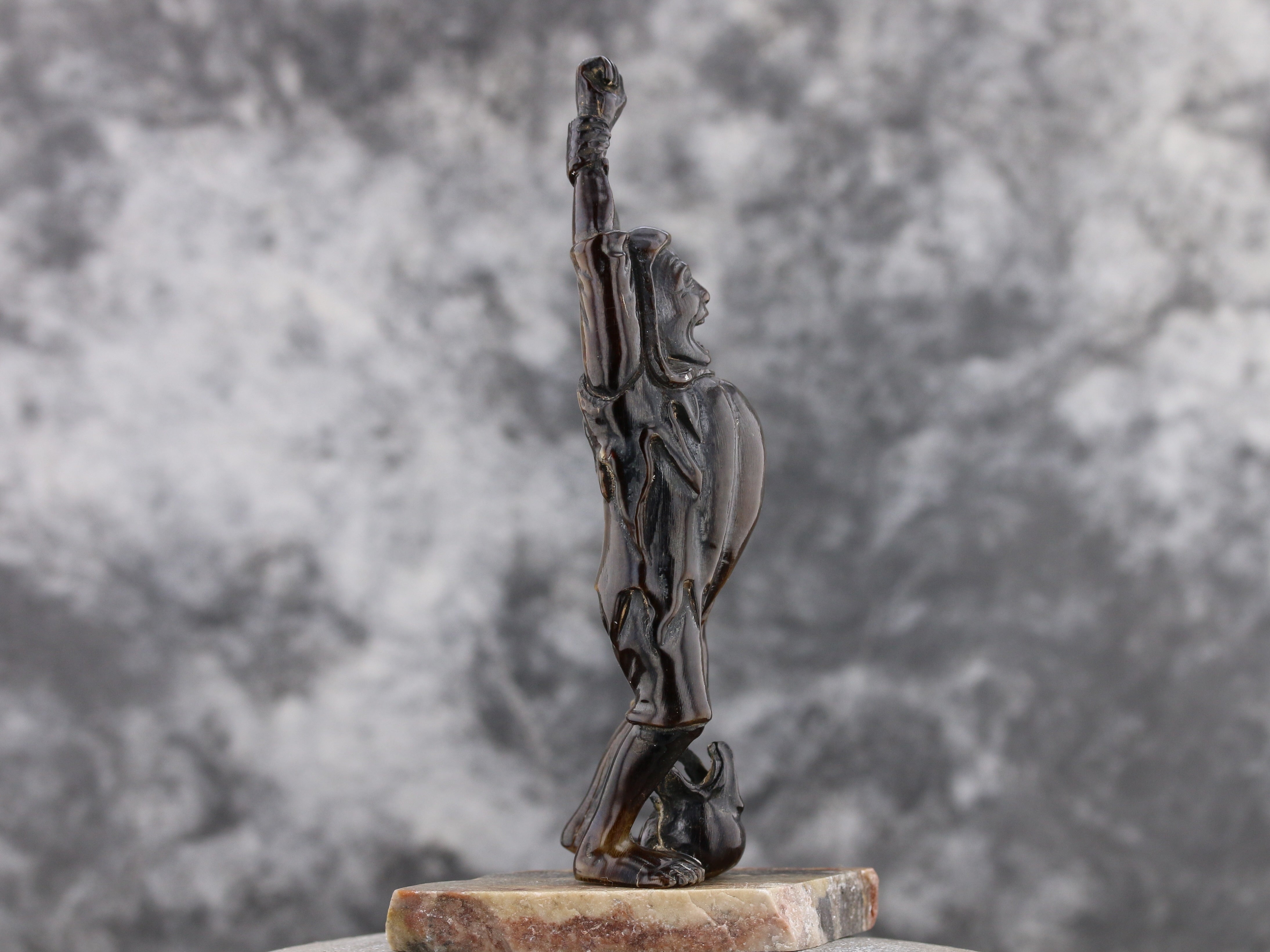 Delve into the rich tapestry of history with our "1950s Rhino Horn Carving: The Traveler's Stretch," a piece that embodies the spirit of endurance and the essence of adventure. Crafted with meticulous attention to detail, this carving portrays a traveler, caught in a moment of relief and aspiration, stretching upwards after a long journey. This artifact not only showcases the exquisite artistry of the past but also serves as a narrative piece, telling a story of perseverance, exploration, and the human connection to the natural world. As we present this piece, we are reminded of the importance of preserving our historical and natural heritage, honoring the narratives encapsulated within these materials.