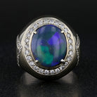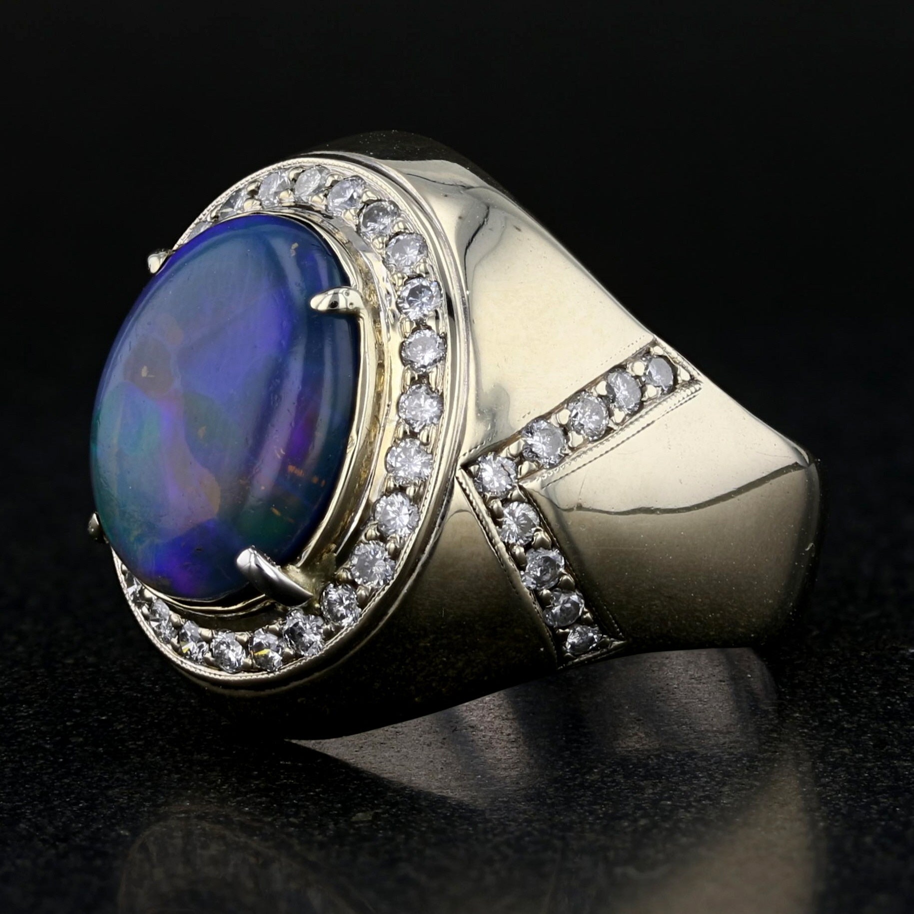 This breathtaking vintage ring showcases a 5.75ct black opal, set beautifully in 18K white gold and surrounded by 44 round diamonds totaling 0.88ct. The opal’s deep, captivating hues contrast elegantly with the brilliance of the diamonds, creating a statement piece that radiates timeless luxury. Weighing 13 grams, this stunning ring is perfect for those with a taste for unique and bold elegance.
