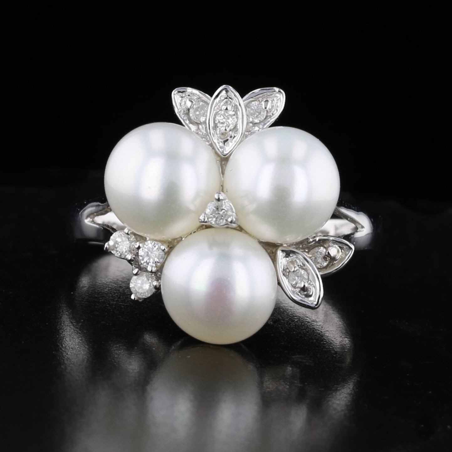 The centerpiece of the ring is three high-quality Akoya pearls (7mm and 7.5mm) known for their radiant luster and smooth surface. The pearls are surrounded by nine round diamonds (0.15 carats total, SI2 clarity, J color), adding a touch of sparkle to the design. The 14K white gold setting enhances the pearls’ natural glow, creating a timeless and refined look.