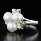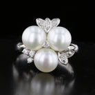 Vintage Akoya pearl and diamond ring in 14K white gold, size 8. Features three Akoya pearls and diamond accents. Available now at David's Jewelry.