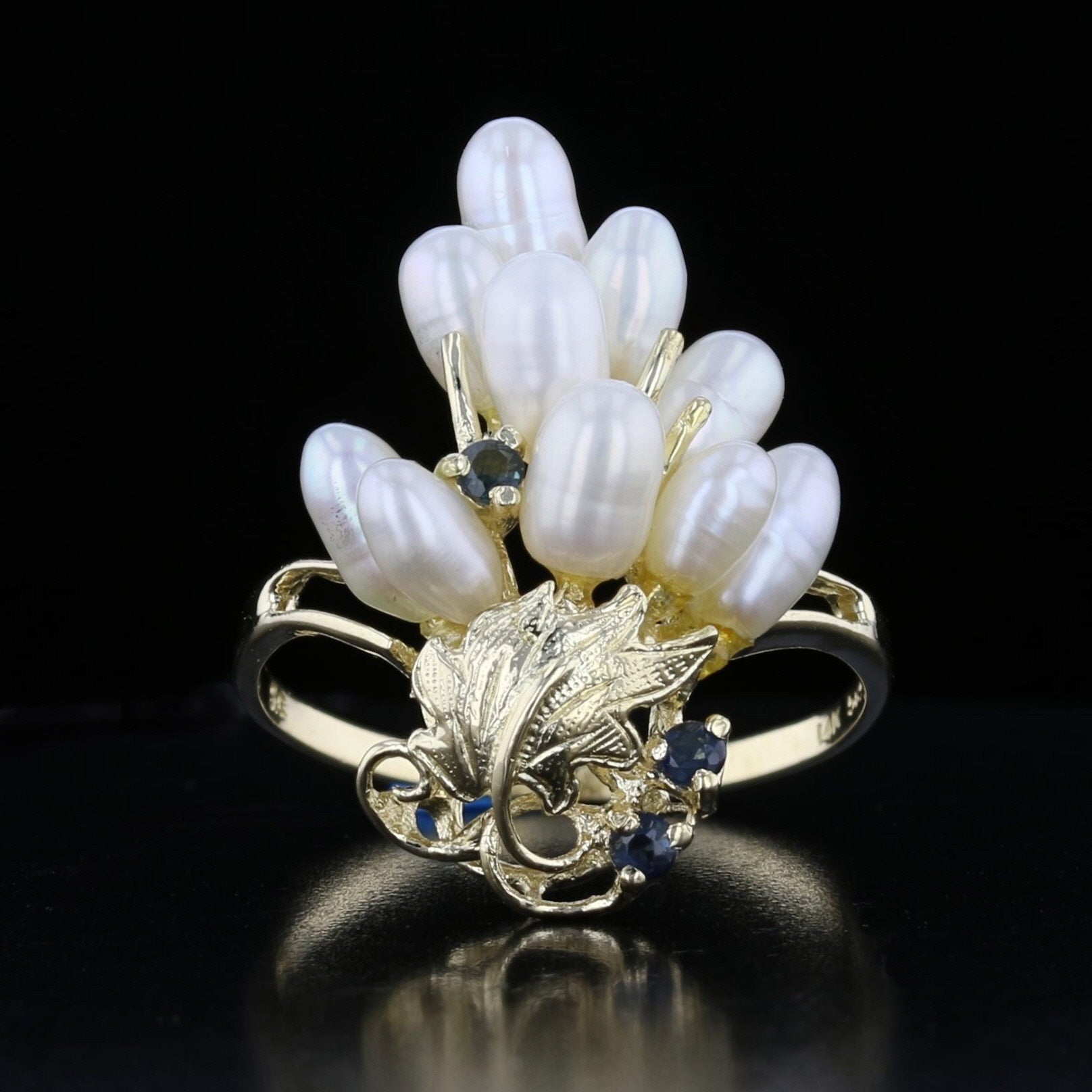 This exquisite vintage ring showcases a beautiful floral design with lustrous white pearls and rich blue sapphires. Crafted in 14K yellow gold, it offers timeless elegance and unique charm, perfect for any collector or jewelry lover.