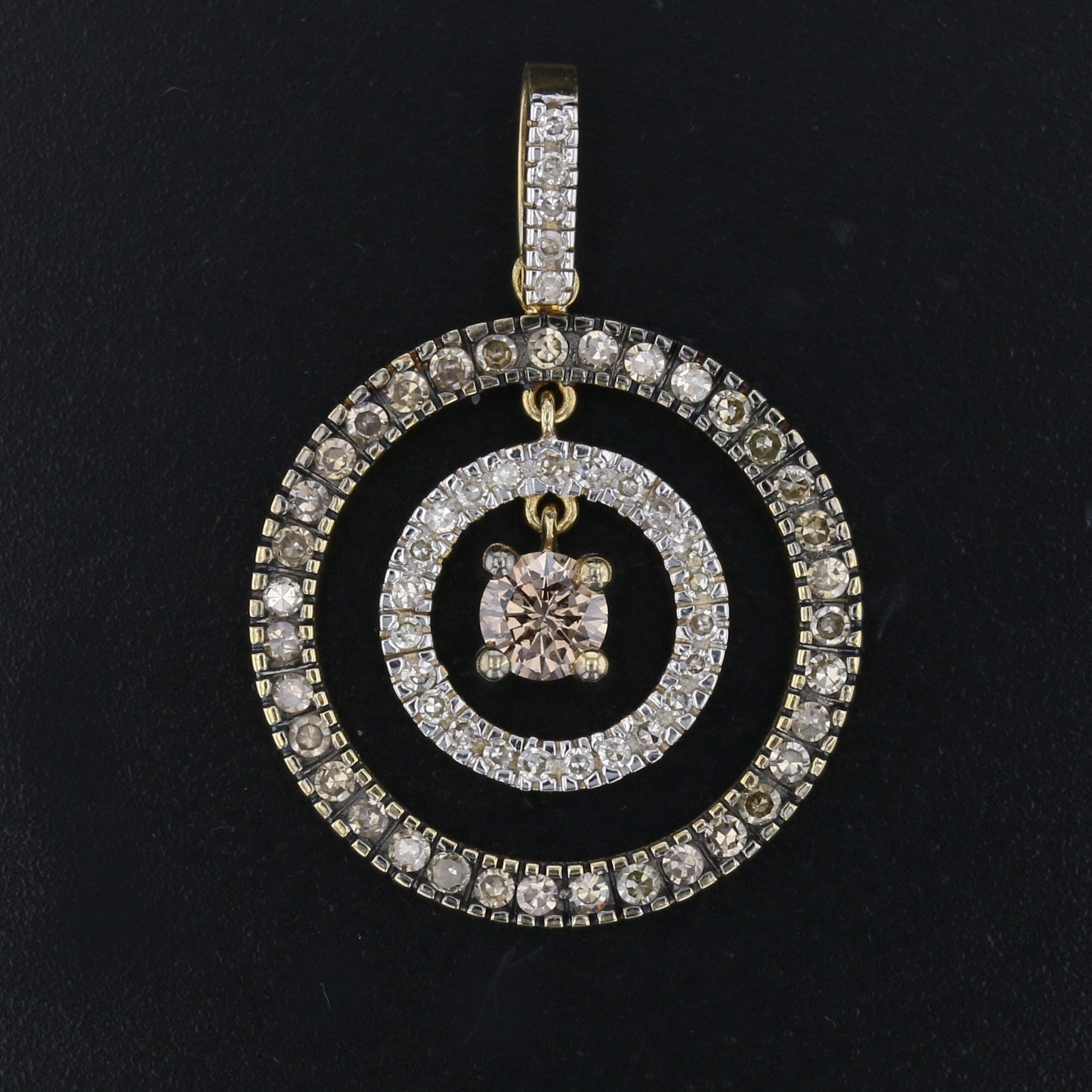 This captivating 14K yellow gold pendant features a stunning round champagne diamond at its center, surrounded by concentric circles of sparkling diamonds. Weighing 1.9 grams, this pendant offers a unique blend of classic design with a modern twist, making it a perfect accessory for both day and evening wear. The warm hues of the champagne diamond and the rich yellow gold create an eye-catching contrast, adding a touch of elegance and luxury to any outfit. A timeless piece for those who appreciate distinctive jewelry.