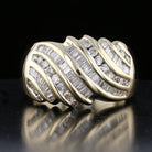 This exquisite vintage ring features a flowing wave design adorned with 52 baguette-cut diamonds (2.35ct total weight, J-K color, I1 clarity) and 24 round-cut diamonds (0.84ct total weight, J-K color, I1 clarity). Expertly crafted in 14K yellow gold and weighing 7.4 grams, this size 7 ring offers bold brilliance and timeless sophistication.