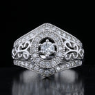 This breathtaking vintage diamond ring combines intricate detailing with timeless elegance. Crafted in 14K white gold, it features a brilliant round-cut center diamond surrounded by a halo of sparkling stones and ornate design accents, making it a truly captivating piece.