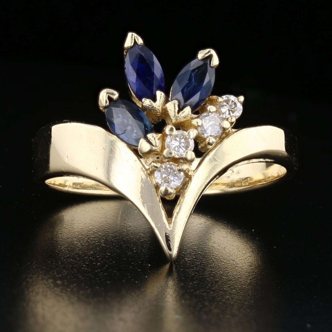 This elegant 14K yellow gold bypass ring features a floral-inspired design with three marquise-cut blue sapphires accented by sparkling round diamonds. The graceful, flowing gold setting enhances the brilliance of each stone, making this a timeless and feminine piece perfect for any occasion.