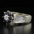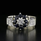 This elegant Vintage Sapphire Diamond Ring, crafted in white gold and weighing 5.6 grams, is the perfect blend of sophistication and timeless beauty. Featuring eight round blue sapphires with a total weight of 0.48 carats, this ring is centered with a single round diamond (0.03 carats), creating a delicate floral-inspired design. A stunning piece for vintage jewelry enthusiasts who love classic elegance.