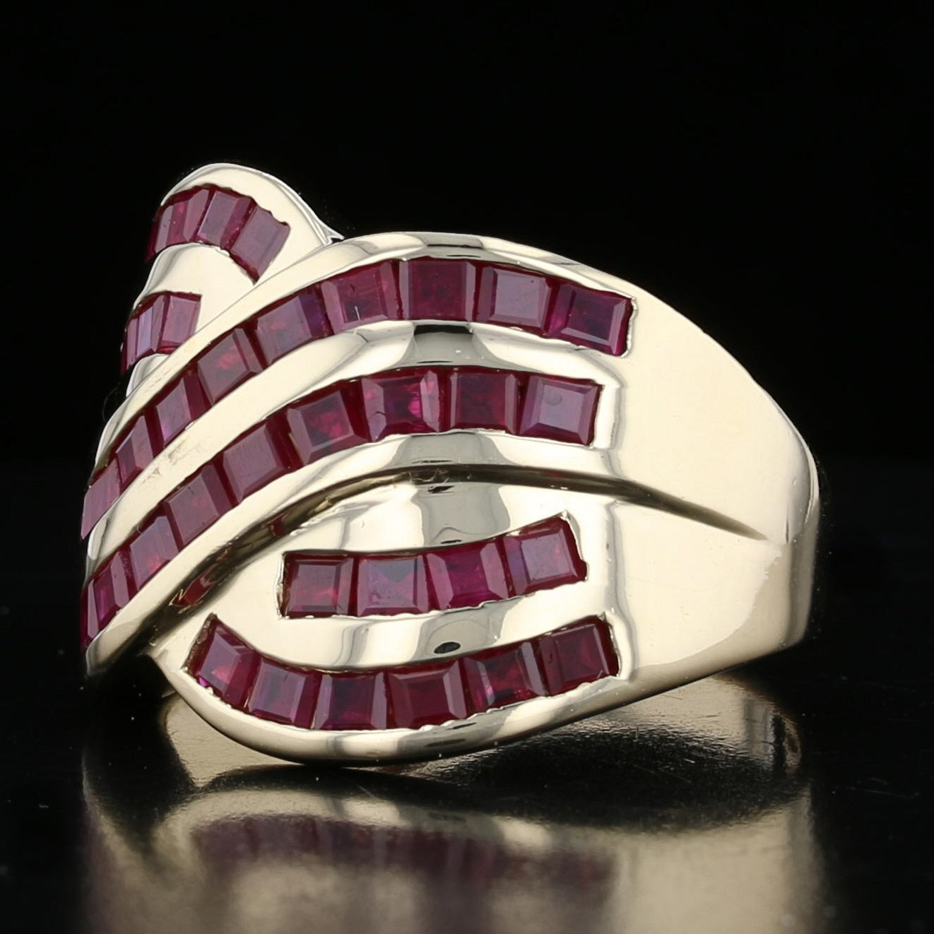 A breathtaking row of fiery red rubies set in warm 10K yellow gold — this vintage channel-set band is pure estate elegance. Forty-two princess-cut rubies sit shoulder-to-shoulder in a seamless channel, catching the light like a glowing ribbon across the finger. The precise cutting and continuous setting is a hallmark of fine vintage craftsmanship, with no prongs to catch, just clean, unbroken sparkle. A ring that wears beautifully alone as an anniversary or right-hand band, and layers gorgeously with a solitaire or plain gold band. One-of-a-kind and ready for its next chapter.