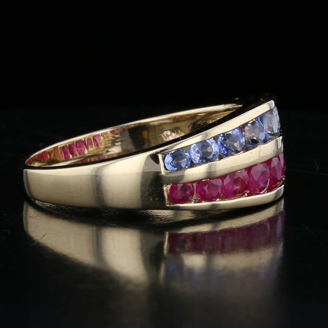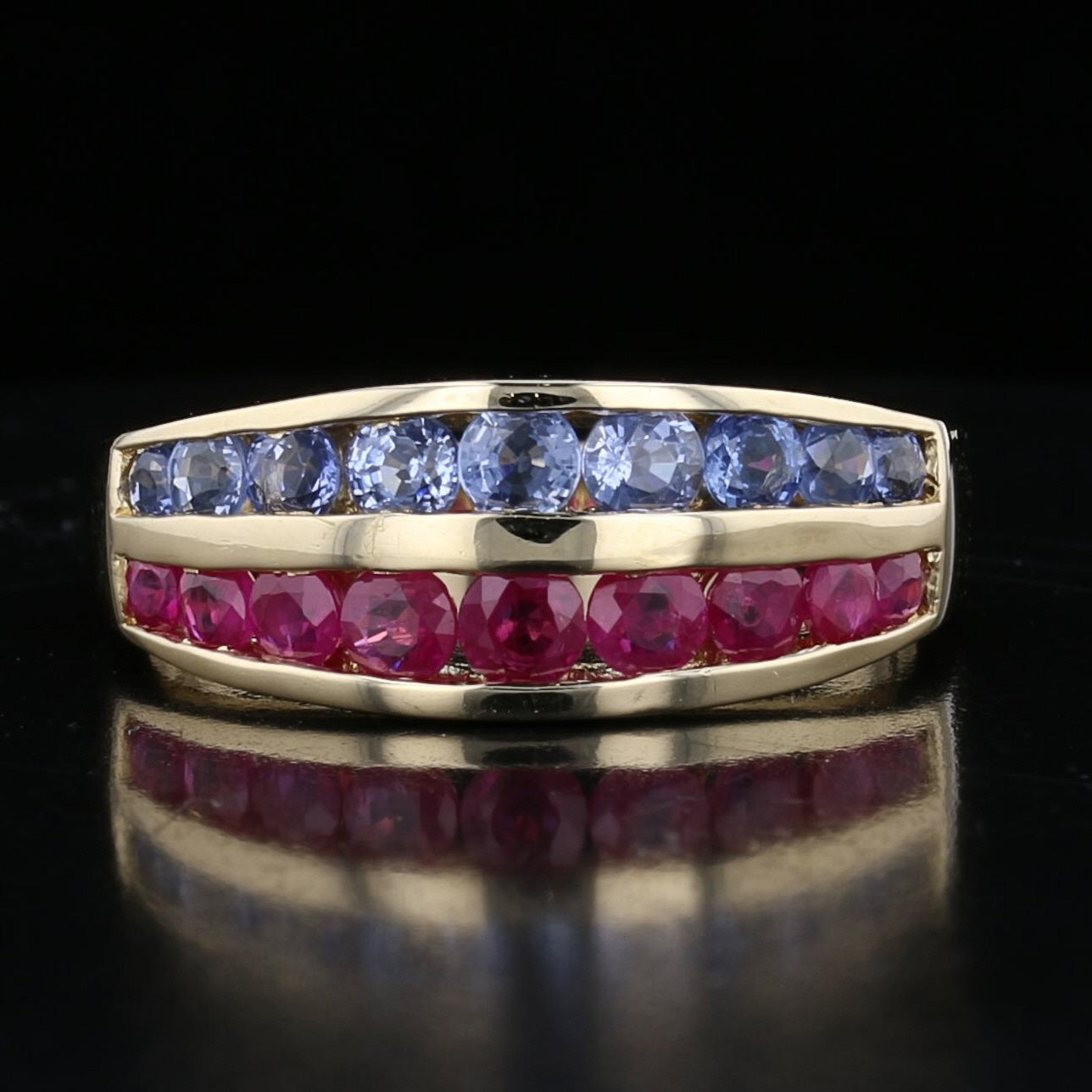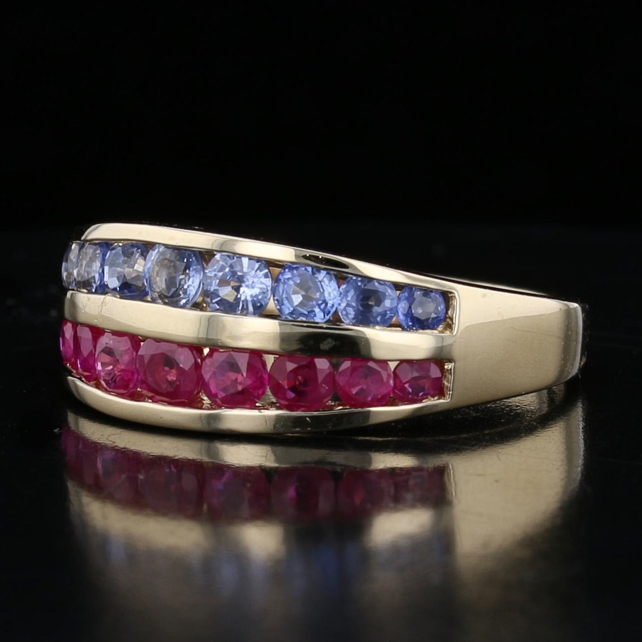 Each row is composed of carefully matched round gemstones set into sleek gold channels, giving the ring a clean and refined look. The warm tone of the yellow gold enhances the brilliance of both the rubies and sapphires, highlighting their vibrant hues.
