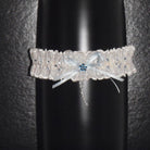 Enhance your bridal attire with our exquisite Delicate Ivory Wedding Garter. Crafted in England, this stunning garter features ivory broodier angles adorned with a blue satin bow and a pearl and diamante trim. The charming daisies on the front of the garter have delicate blue crystal centers, adding an extra touch of elegance. Complete with a blue bow on the back seam, it's the perfect accessory to elevate your special day.