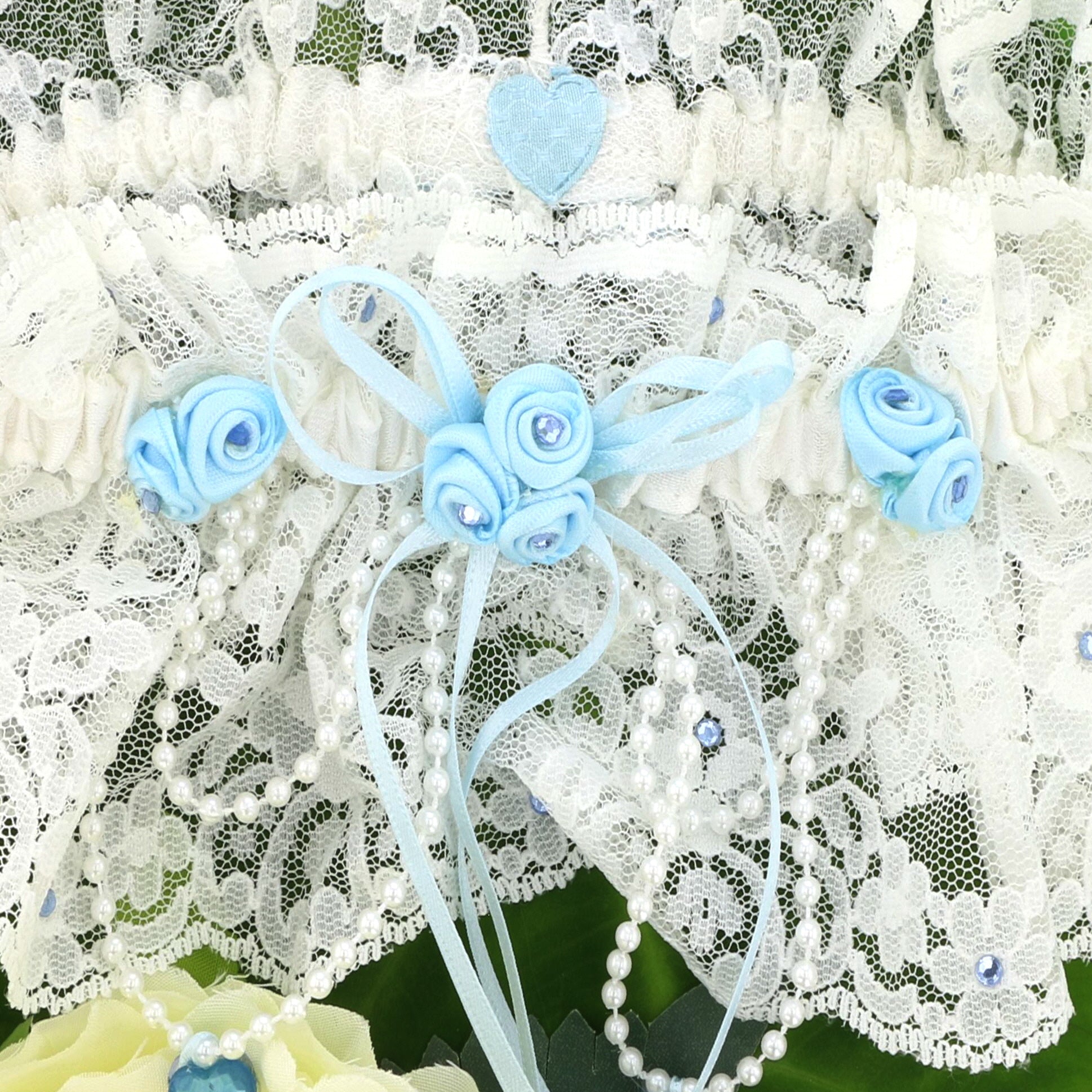 - Embellishments: Satin ribbons, blue rosebuds with pearl blue crystal centers, pearl strings with drop blue crystal hearts, scattered blue crystals