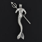 Embrace the mythical power of Triton with this captivating pendant. Crafted out of sterling silver, the pendant showcases Triton holding a trident across his body with intricate detailing and craftsmanship. The cohesive bail seamlessly integrates with the body and can accommodate a chain of 6mm. With a weight of 10g and a total length of 52mm (approximately 2 inches), this pendant embodies strength and mythology.
