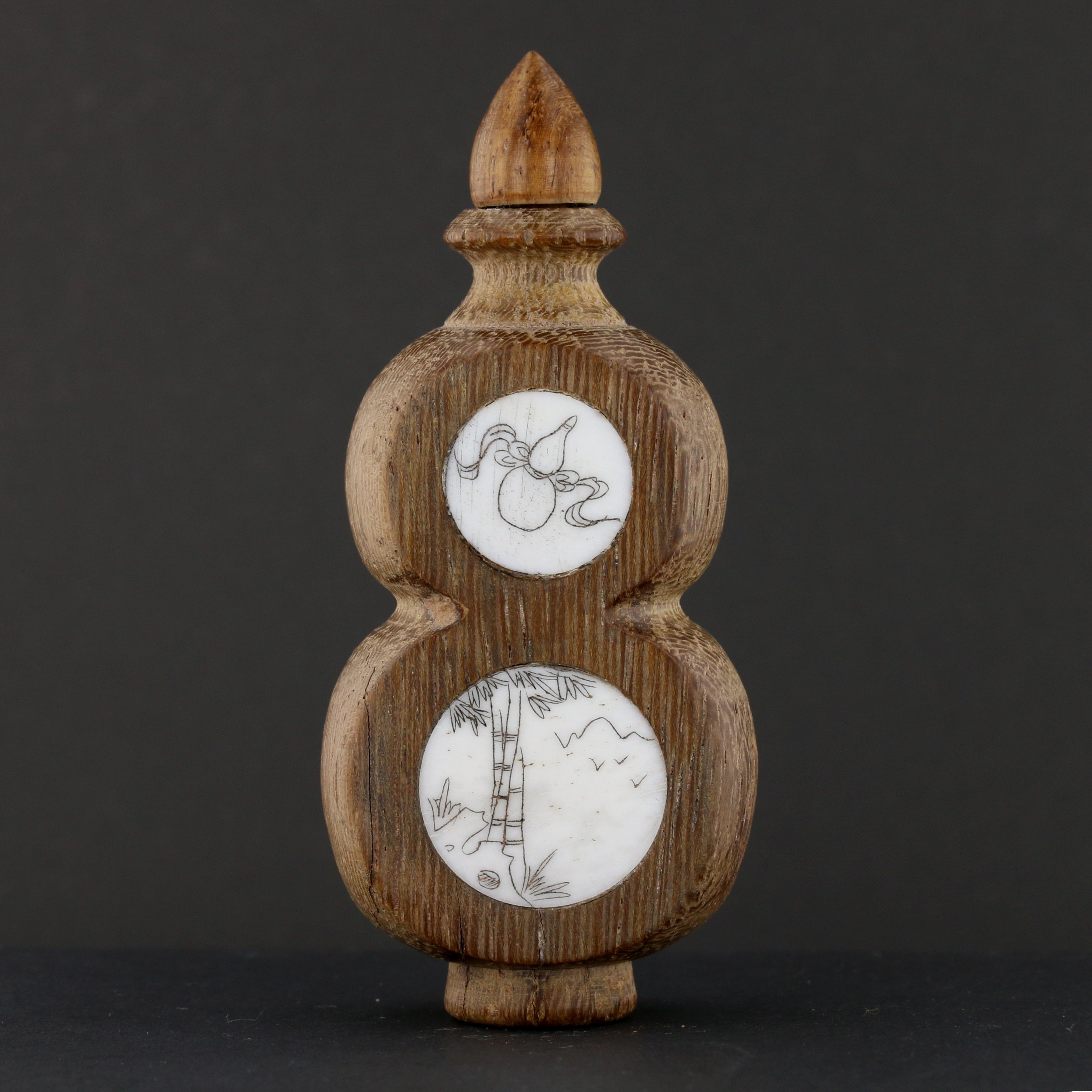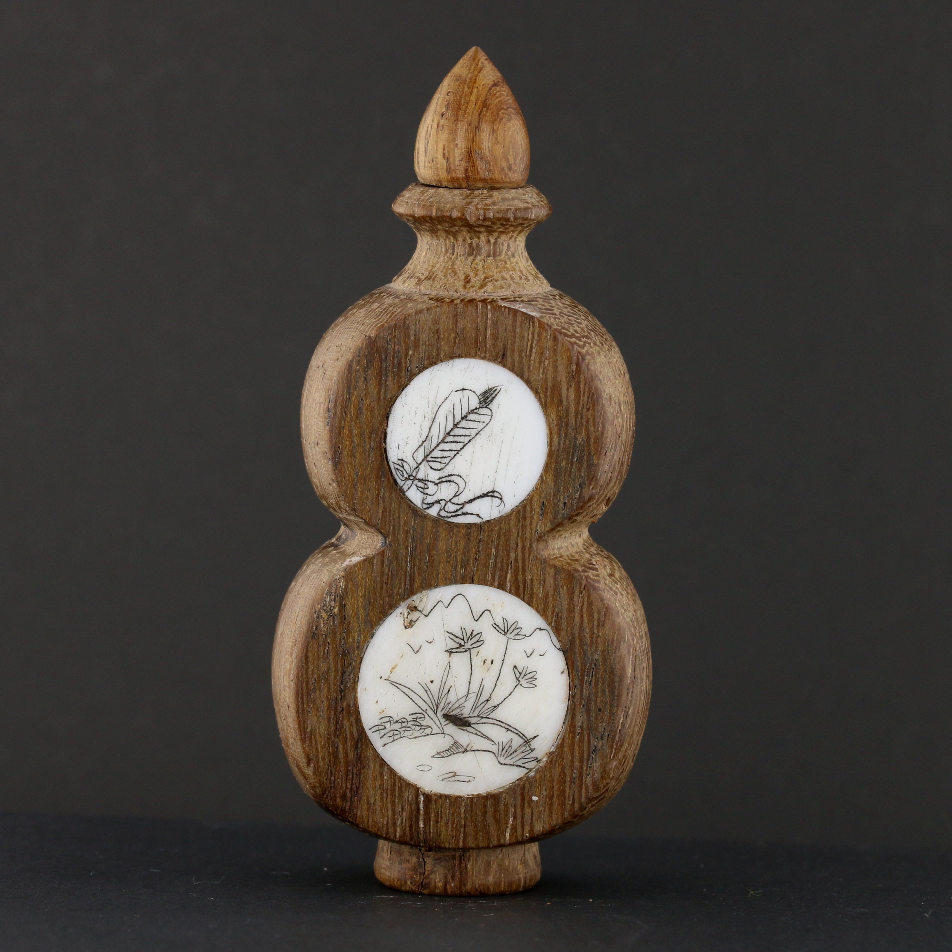 "Antique Chinese Snuff Bottle with painted porcelain panels & wooden frame. A unique collectible with intricate designs. Approx. size: 3.5” x 1.5"."