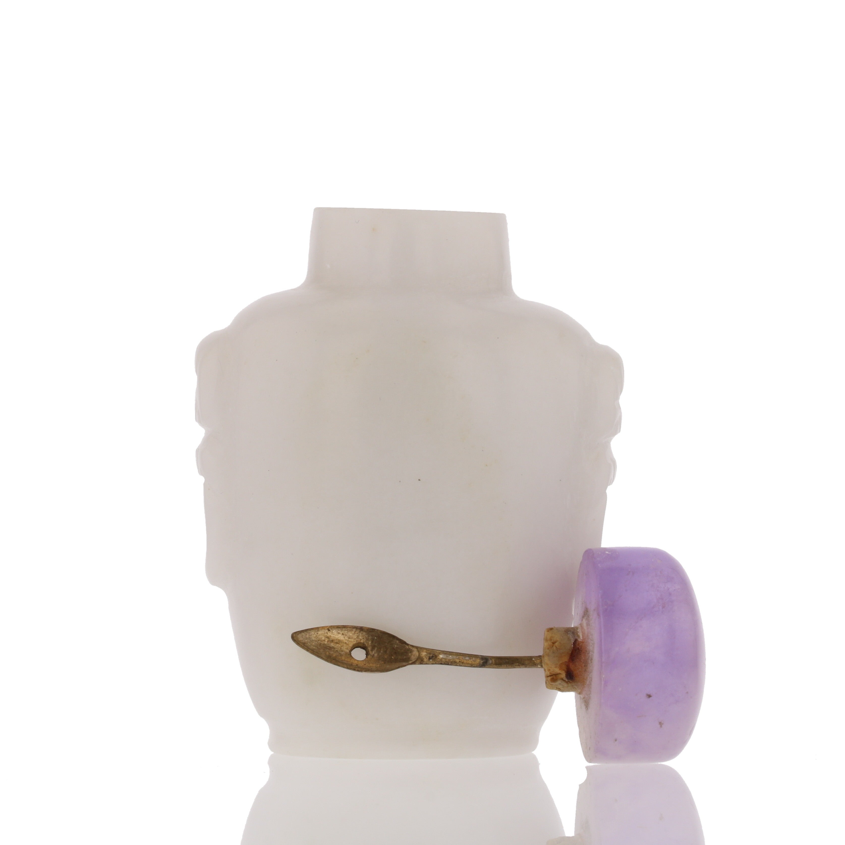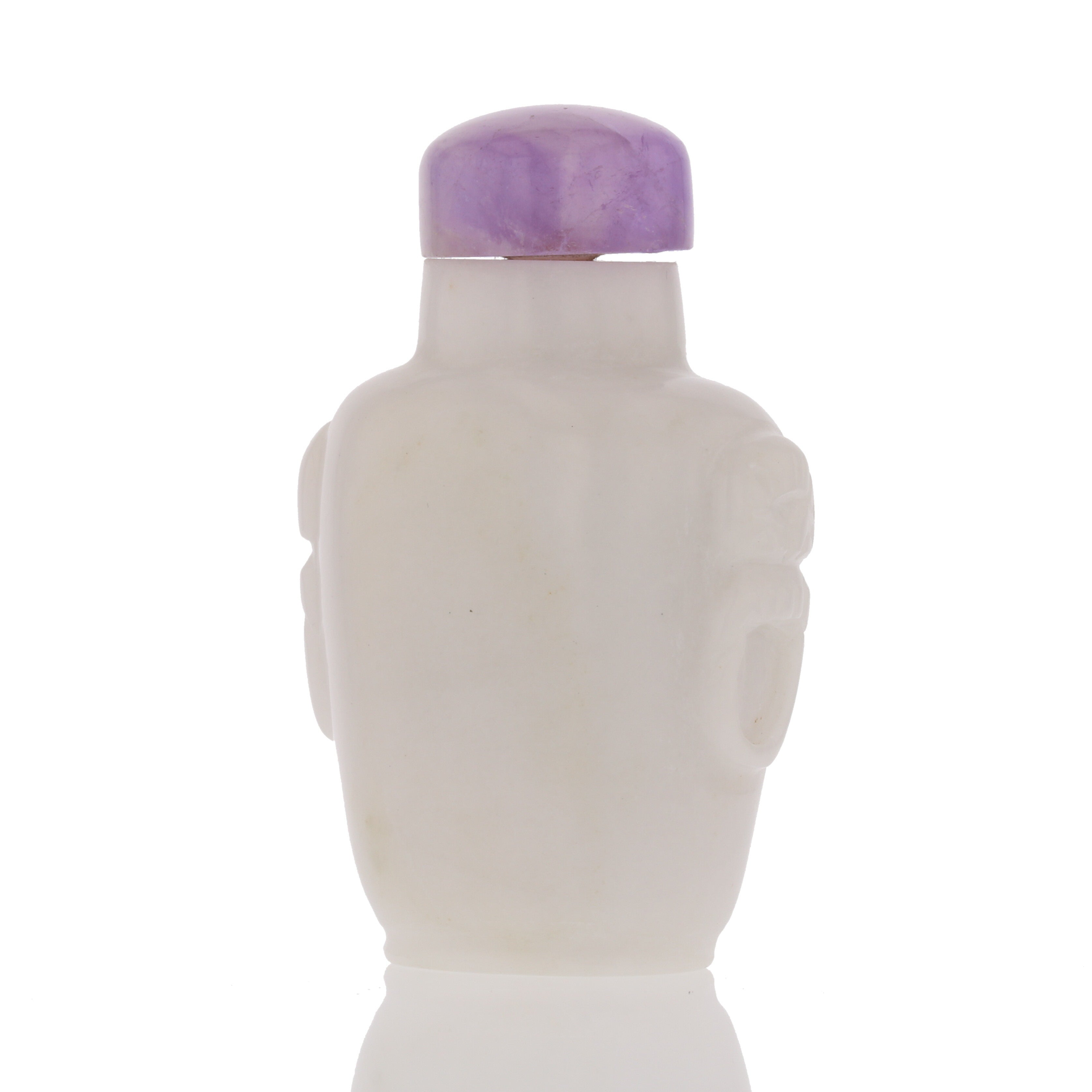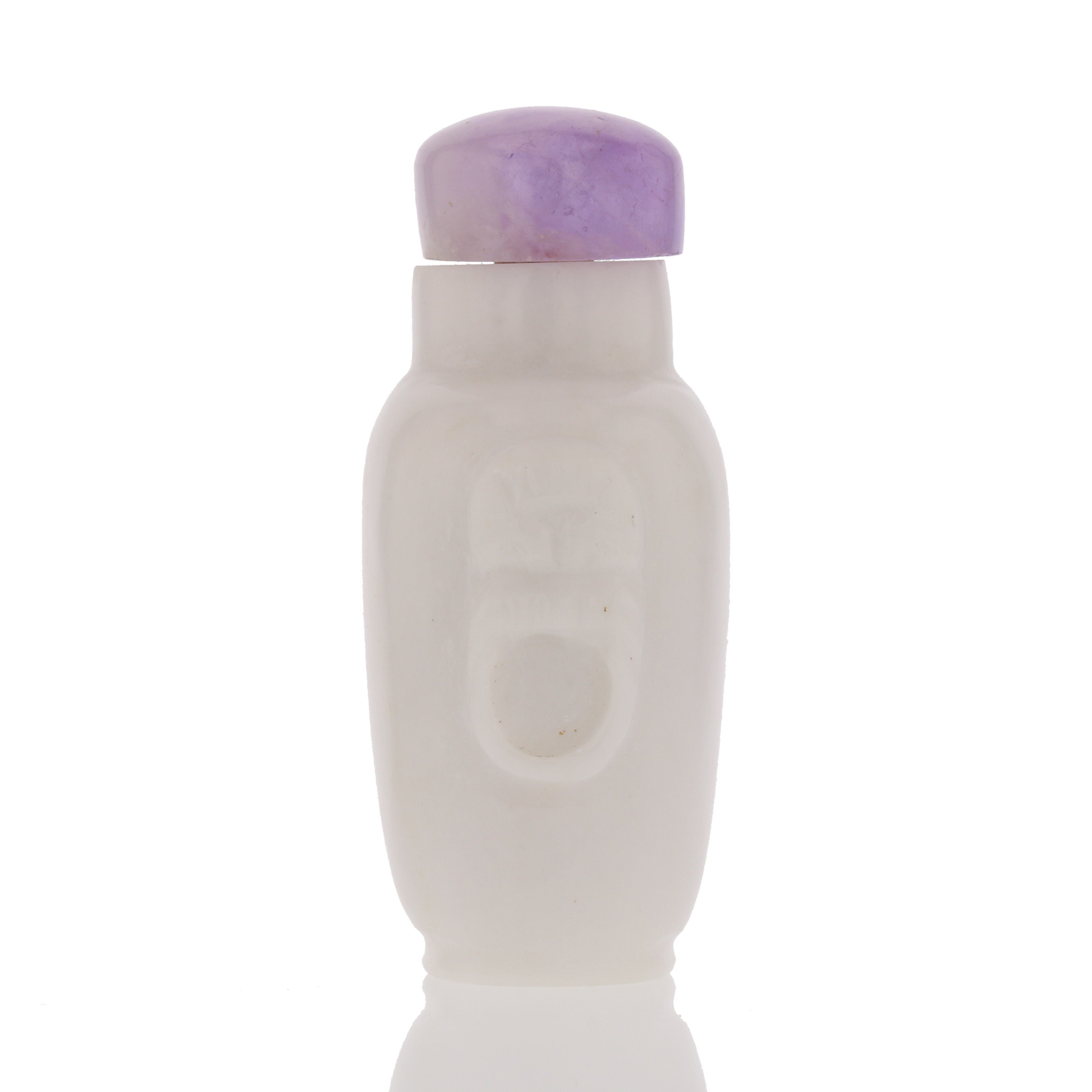 "Antique Chinese snuff bottle, 1.5" x 2.5". Features white carved design and amethyst cap. Item Code: 882184."