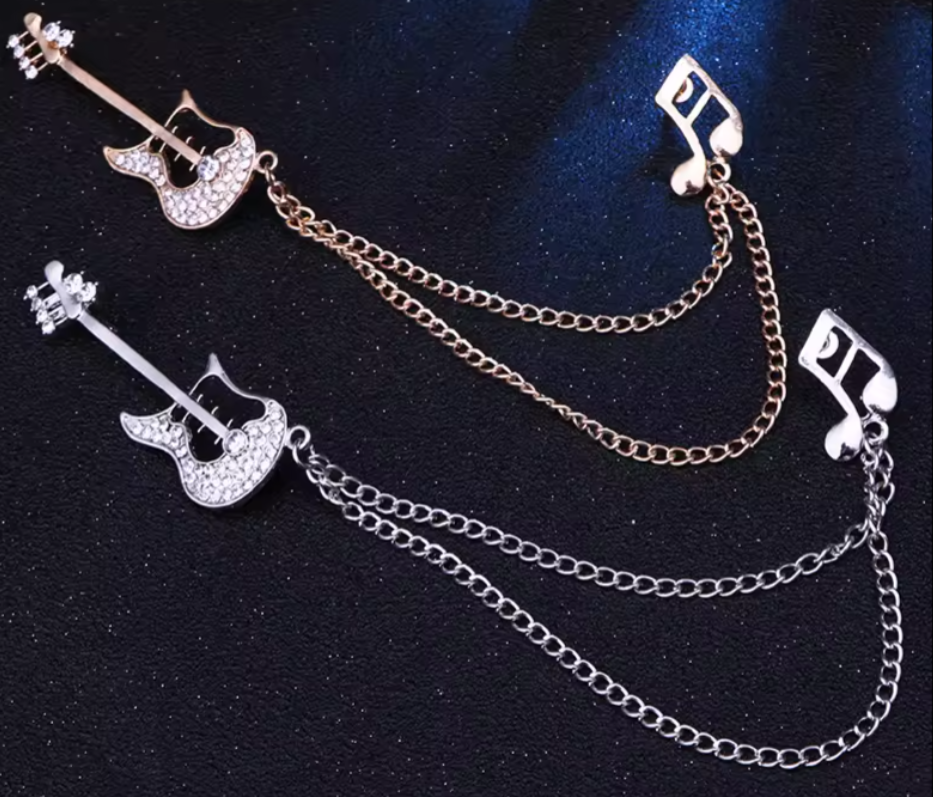 Rock your style with this Guitar Lapel Pin with Chain, featuring a detailed 2-inch guitar design paired with a 3-inch chain connecting to a musical note. Available in both Silver and Gold tones, this striking accessory is perfect for music enthusiasts and fashion-forward individuals alike. Add a touch of musical flair to your outfit with this unique lapel pin.